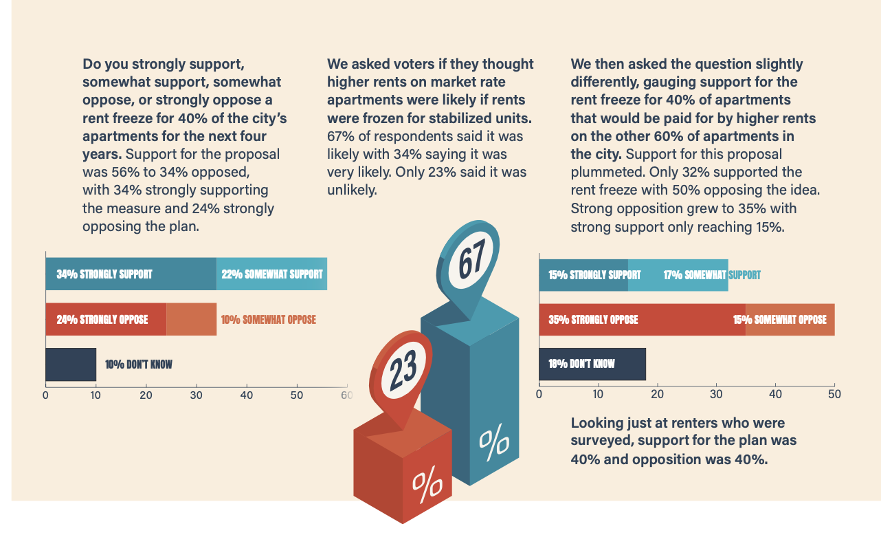 Our polling also looked at the proposal to freeze rents for roughly one-million stabilized apartments in New York City. Instead of mentioning the number of apartments, we asked voters if they supported a rent freeze for 40% of renters, which is equal to the one million stabilized apartments. Among all voters 58% supported this rent freeze. Among stabilized tenants, 65% supported the rent freeze.